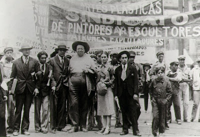 Fotografia de Tina Modotti de uma Marcha do 1ºde Maio de 1929 em que se vêem Diogo Rivera e Frida Khalo