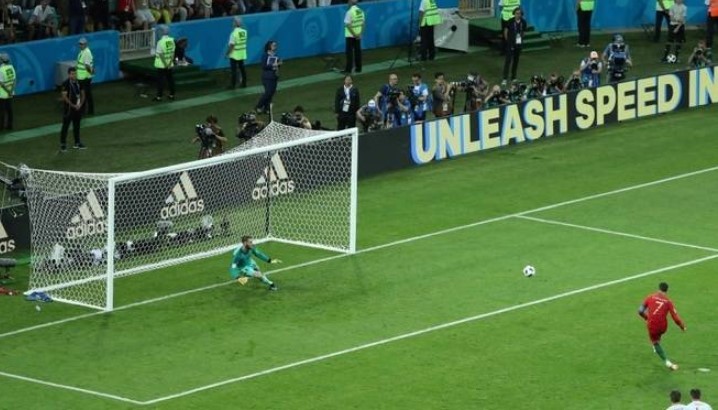 O árbitro italiano Gianluca Rocchi marcou o penalti sem hesitar. O astro português foi para a cobrança e marcou no canto esquerdo alto do guarda redes De Gea, que pulou para o lado oposto: 1 a 0.