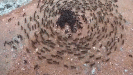A espiral da morte das formigas é o exemplo perfeito do que pode acontecer quando os instintos dão errado. Formigas carnívoras cegas, principalmente formigas operárias, dependem de trilhas de feromônios deixadas pela formiga líder. Conforme a expedição de milhares de indivíduos se move, eles reforçam as trilhas. Entretanto, se uma delas se desviar do caminho estabelecido, pode se prender em um loop ao redor do grupo, levando as outras atrás dela. Isso às vezes leva a grandes vórtices giratórios.