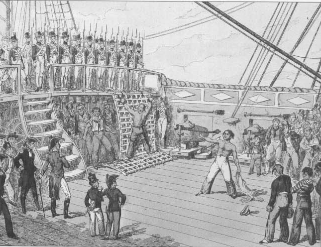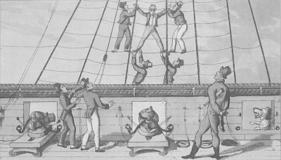 A disciplina na Marinha Real nos séculos XVIII e inícios do XIX, é muitas vezes visto como um código severo e inflexível de 'começar', com o chicote e acabar com um enforcamento. Mas para tirar a punição fora do contexto por vezes é perder a comparação entre a vida na terra e vida no mar durante o período. O código de justiça georgiana era conhecido, com razão, como o código de sangue. Em terra, a um homem podia ser dada uma sentença de prisão longa ou transportado para um navio para a vida por crimes relativamente menores, ele pode ser enforcado por roubar tão pouco como um lenço. A prisão rotineiramente era mantida por 20 presos a uma cela que media 20 pés por quinze anos. No mar as regras que os homens obedeceram eram conhecidos como os Artigos de Guerra. Um homem só poderia ser enforcado por traição, motim, ou deserção. Sodomia era também uma ofensa capital, mas poucos homens foram processados ou enforcados por isso, e parece provável que tenha sido uma ocorrência rara em um navio de guerra. O espaço aberto dos homens oferecia poucas oportunidades de privacidade. No mar, a disciplina era relativamente fácil de manter. Os marinheiros sabiam que suas vidas dependiam de trabalhar em conjunto para evitar o naufrágio do navio, ou ser tomada pelo inimigo. Isso pode explicar em parte que eram necessários ter pelo menos 20 anos para comandar um navio de marinheiros experientes, desde que o capitão não comprometesse a sua segurança a tripulação estava disposta a trabalhar para ele.
